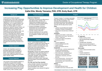 A needs assessment was conducted with teachers and parents to identify developmental concerns and participation barriers related to fine motor, gross motor, and social skills. Based on these findings, an inclusive play program was integrated into center time and recess across three preschool classrooms (approximately 60 children). The program incorporated developmentally supportive activities, environmental modifications, and facilitation strategies rooted in occupational therapy practice. A play checklist was administered at three intervals—initial, midterm, and final—and qualitative feedback was gathered from teachers throughout implementation.