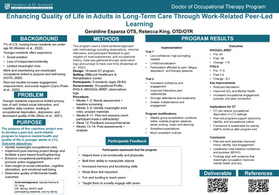 Younger adults residing in long-term care (LTC) institutions face numerous challenges related to identity, engagement, social interactions, mental health, and overall quality of life. This doctoral capstone project developed and implemented a peer-led, work-related intervention program designed to promote mental health, enhance occupational engagement, and improve the quality of life for younger adults residing in long-term care facilities. A 14-week program, comprising an occupational profile, needs assessment, role selection, and two trials of peer-led meaningful work activities, was completed by five participants, aged 29 to 63. The Model of Human Occupation (MOHO) served as the foundation for a qualitative program evaluation methodology. Results indicated an improvement with PHQ-9 scores decreasing across all participants and WHOQOL-BREF scores increasing. Participants demonstrated greater confidence, social interaction, purpose, and self-identity through engagement in work-related leadership roles. Significant improvements were noted between the first and second trials in observations and feedback, including increased independence, smoother sessions, improved peer communication, and stronger group dynamics. The program demonstrated that peer-led occupational engagement can transform the LTC environment into a meaningful community for younger residents, despite obstacles such as varying health conditions, staffing limitations, pain levels, and limited access to materials, which can influence implementation. This program highlights the vital role of occupational therapy in alleviating occupational deprivation and increasing engagement, identity, and well-being in younger LTC populations. Moving forward, this program can benefit residents in LTC across all ages, and the integration of peer-led work programs offers possible future directions for continued development and an increased sense of community and belonging.