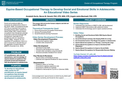 Adolescents experience rapid physical, emotional, and social changes that often challenge self-regulation and social-emotional skill development. Occupational therapy (OT) practitioners are equipped to address these needs through a variety of ways, like equine-based occupational therapy (EBOT), yet resources on this setting remain limited. This capstone project developed an educational video series to guide OT practitioners in using equine-based occupations to promote social-emotional learning (SEL) skills in adolescents, targeting self-awareness, self-management, social awareness, relationship skills, and responsible decision-making. The seven videos were posted to YouTube for easy access. This resource serves as a tool OT practitioners can use for knowledge and intervention ideas in EBOT. Future research should quantify the benefits of equine-based occupations to improve social and emotional skills in adolescent clients.