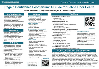 This capstone project developed Regain Confidence Postpartum: A Guide for Pelvic Floor Health, an occupation-focused resource designed to help postpartum individuals understand pelvic floor dysfunction and return to meaningful routines. A needs assessment was completed through clinical observation, discussions with providers at Purely Pelvic Floor, and a review of current evidence. The assessment identified limited awareness of the role of occupational therapy and a need for accessible and functional education and intervention strategies.