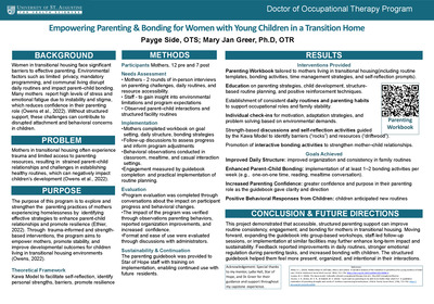 This capstone project was completed at Star of Hope, a transitional housing facility for women and children. A needs assessment revealed that mothers struggled with routine consistency, emotional regulation, and parent–child bonding due to environmental demands. In response, a customized parenting guidebook was developed using occupational therapy principles to provide structure, bonding activities, and self-reflection strategies. Mothers who engaged with the guidebook reported improvements in organization, confidence, and interactions with their children. Sustainability was supported by leaving the guidebook with the facility and training staff for continued use. The project highlights the impact of simple, structured OT interventions in promoting resilience and meaningful family routines.