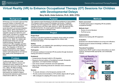 This capstone project developed an educational guidebook to help pediatric OTs integrate evidence-based VR strategies into practice. The guidebook was created to enhance engagement, for children with developmental delays, impacting sensory and motor skills. By exploring VR’s benefits and barriers, the project guides therapists in adapting tech-enhanced approaches to individual needs.