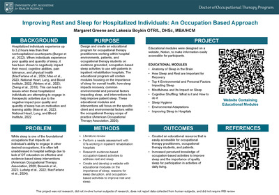 Design and create an educational program for occupational therapy practitioners working within hospital environments, patients, and occupational therapy students on evidence grounded, occupation-based sleep activities to use with patients in inpatient rehabilitation hospitals. The educational program will contain modules focusing on the importance of sleep for overall health, how sleep impacts recovery, common environmental and personal factors impacting sleep, and interventions to help improve patient sleep. These educational modules and interventions will focus on the specific client and environmental factors within the occupational therapy scope of practice (American Occupational Therapy Association, 2020).