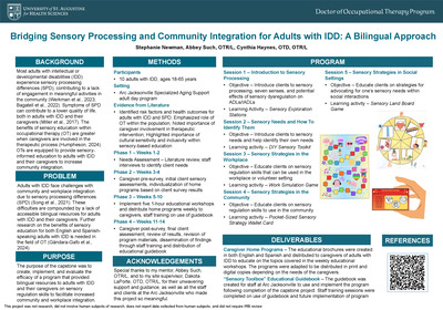 The capstone project included creation, implementation, and evaluation of an educational program. The program provided education for adults with intellectual and developmental disabilities and their respective caregivers. The educational materials included development and implementation of educational workshops of sensory processing strategies in the community, work, and social settings for adults with IDD and bilingual home programs created for caregiver education. The program was evaluated through pre- and post-surveys administered to caregivers to demonstrate changes in knowledge of sensory processing strategies, as well as client assessments administered to assess changes in client understanding of sensory strategies.