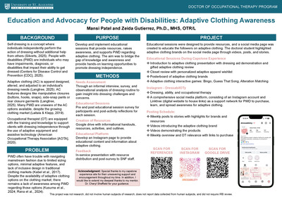 The purpose of this educational capstone project is to develop and implement educational sessions that provide resources, raise awareness, and support individuals with disabilities in accessing adaptive clothing. The aim was to bridge the knowledge and awareness gap and provide hands-on learning opportunities to promote dressing independence.