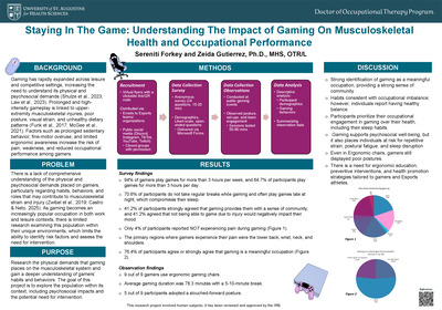 The purpose of this capstone is to examine the physical demands that gaming places on the musculoskeletal system and to gain a deeper understanding of gamers’ habits and behaviors. The goal of this project is to explore the population within its context, including psychosocial impacts and the potential need for intervention. By doing so, this research aims to provide valuable insights to both gamers and clinicians, supporting and enhancing occupational performance in gaming.