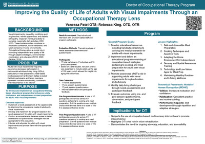 Adults with visual impairments often experience decreased independence, safety concerns, and reduced confidence in daily occupations, particularly during meal preparation. This capstone project aimed to develop and implement an occupation-based educational program to support safe and independent cooking for adults with visual impairments. A needs assessment was conducted at Envision Dallas, resulting in a program focused on meal preparation and the use of adaptive strategies. The program consisted of twelve structured lessons delivered through a combination of individual sessions and group-based instruction. Outcomes were measured using pre- and post-session questionnaires, informal observation, and participant and family feedback. Results indicated improvements in participants’ confidence, safety awareness, and use of adaptive tools during cooking tasks. Findings support the role of occupational therapy in enhancing independence and quality of life for adults with visual impairments through client-centered, occupation-based intervention.