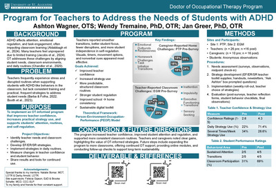 The capstone project focused on supporting teacher participants from Eden Gardens Fundamental Magnet Elementary by providing practical strategies to address students who struggle with attention, regulation, and daily classroom routines. After completing a needs assessment, it was clear that many teachers faced similar challenges, including difficulty with transitions, staying on task, and responding when students became overwhelmed. To address this, created an OT-led teacher-training program that uses the PEOP model and focuses on simple, practical strategies teachers can implement right away. This included visual cues, sensory and movement supports, and minor changes to the classroom setup. As teachers began using these tools, they checked in regularly to offer guidance, which helped make adjustments to the strategies as needed. Findings led teachers to feel more confident, use the provided strategies more consistently, and notice improvements in student engagement and daily routines. Overall, the project highlighted occupational therapy's role in strengthening teacher support and increasing teachers' confidence in selecting appropriate strategies to manage students' ADHD-like behavior. Making simple changes helped create a calmer classroom environment and increased the ability to meet the needs of students with attention and regulation challenges associated with ADHD.