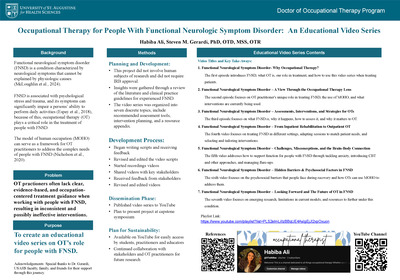 Functional Neurological Symptom Disorder (FNSD) is a complex condition that significantly disrupts occupational performance, identity, and participation. Despite the important role occupational therapy plays in addressing these challenges, many practitioners report uncertainty about how to apply occupation-based models- particularly the Model of Human Occupation (MOHO)- to guide treatment. This capstone project developed a seven-part educational video series to increase practitioner confidence and provide clear, evidence-informed strategies for assessment, intervention planning, and client-centered reasoning. Videos cover essential topics such as OT’s role in FNSD, psychosocial contributors, brain–body connections, functional retraining, and adapting interventions across settings. Hosted on YouTube for accessible dissemination, this series serves as a practical resource for OT practitioners seeking foundational knowledge and clinically relevant guidance in FNSD care. Future work may explore effectiveness, practitioner outcomes, and opportunities for integration into continuing education.