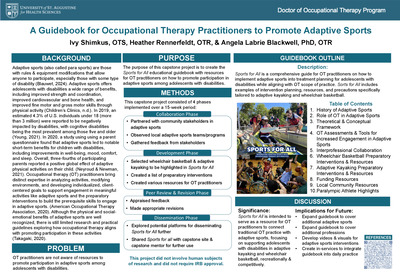 Adaptive sports offer meaningful physical, social, and emotional benefits for adolescents with disabilities; however, many occupational therapy (OT) practitioners report limited training and resources to support these activities within practice. This capstone project aimed to address this gap by developing Sports for All, an educational guidebook designed to help OT practitioners promote engagement in adaptive sports among adolescents with disabilities. Guided by the Canadian Model of Occupational Performance and Engagement and the PERMA well-being framework, the project emphasized the importance of person, environment, occupation, and positive psychological factors that support meaningful engagement in activities that promote overall well-being in adolescents with disabilities. Using a 15-week, four-phase process- collaboration, development, peer review, and dissemination- the project incorporated stakeholder partnerships, observations of local adaptive sports programs, and feedback from practitioners and community organizations. The guidebook provides a foundational background on adaptive sports, outlines the role of OT practitioners in incorporating adaptive sports into treatment planning, and offers practical tools including assessments, intervention planning resources, and preparatory activities for wheelchair basketball and adaptive kayaking. Additional components include interprofessional collaboration strategies, funding resources, and local community resources to support implementation. The intent of Sports for All is to bridge the gap of resources gap that often exists following OT academic preparation, equipping practitioners with accessible, evidence-informed materials to integrate adaptive sports into clinical and community-based practice.